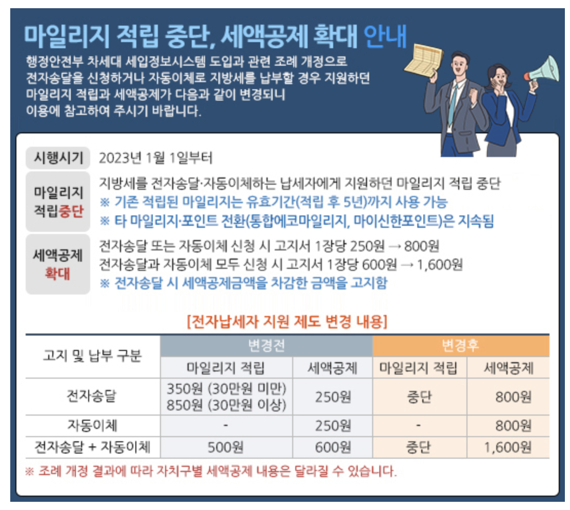 세액 공제만 보면 적은데 또 마일리지 적립이 함께 있으니 그나마 나은 것 같기도 하다. (그래 봐야 최대 천 원이지만...) 마일리지 적립은 말 그대로 포인트가 쌓이는 것인데 '과세 정보를 종이고지서 대신 E-mail로 고지받아 전자적인 방법으로 납기 내 납부 시 지급'되는 포인트로 건당 30만 원 미만인 경우에는 350원, 30만원 이상인 경우 850원이 적립되지만, 전자 고지 후 자동 납부인 경우에는 500원만 적립된다. (아니 세액 공제에서 좀 더 준다고 여기서 깎는 건가... 깐깐하다.) 좋은 점은 이 마일리지가 쌓이면 다른 세금을 낼 때 쓸 수도 있고 본인 계좌로 송금할 수도 있으며 기부를 할 수도 있다는 것.