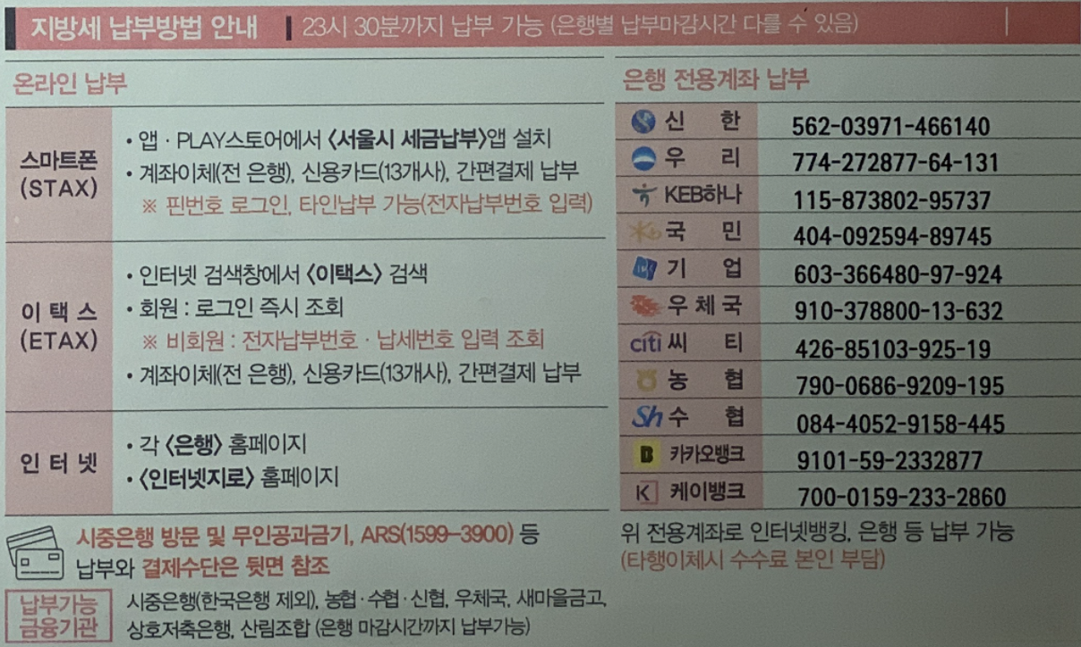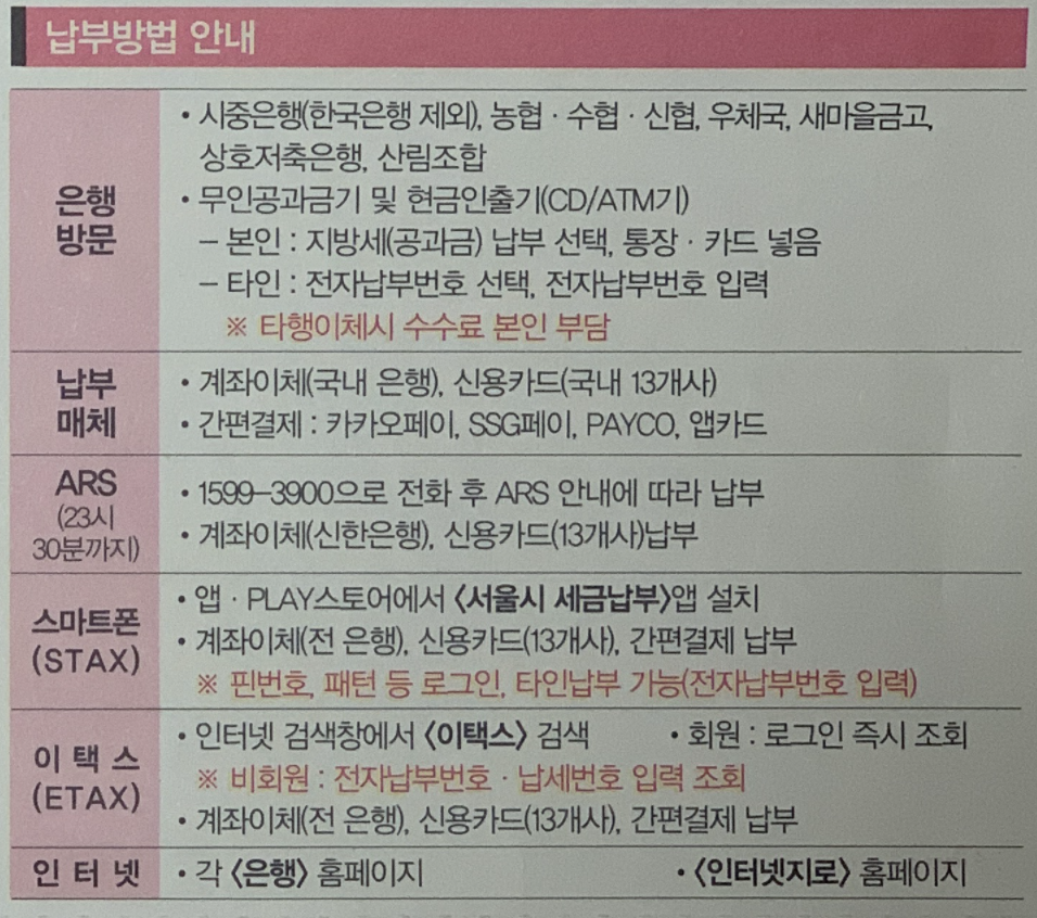 세금 납부 방법은 여러 가지가 있다. 스마트앱, 인터넷, 계좌이체, ARS전화 등 가능한 모든 방법으로 다 납부할 수 있다. 고지서에 나와있는 방법 말고도 위택스(WETAX: 행정안전부에서 운영하는 지방세 신고, 납부 웹사이트)에서도 납부할 수 있다. 방법이 너무 많아서 고민이 될 정도였는데 나는 서울에 사업자 등록이 된 분들이라면 ETAX를 추천한다. 여러가지 혜택을 받을 수 있기 때문이다. 내 경우는 신용카드의 포인트를 사용해서 세금 중 만원 정도를 포인트로 결제할 수 있었다. 처음에는 스마트폰 STAX를 이용해서 결제를 하려고 했는데, 결제 직전에 뜨는 메시지를 보다가 '현대카드 M포인트를 이용한 결제는 이택스(ETAX)에서만 가능하다'는 메시지를 읽었다. 그래서 STAX에서 결제하지 않고 바로 ETAX로 가서 포인트를 사용해서 결제를 했다. 현대카드를 주로 이용해서 M포인트가 많이 쌓인 분들이라면 유용하게 쓸 수 있는 사용처라고 생각이 된다. 내야 하는 돈은 맞지만 왠지 아깝게 느껴지는 세금의 일부를 포인트로 낼 수 있다니 이득 보는 기분. (대략 M포인트 15,000포인트가 현금 10,000원 정도의 비율로 전환된다는 점을 참고하자.) > 2023년부터 1월 18일, 이택스ETAX 마일리지 적립 중단 발표