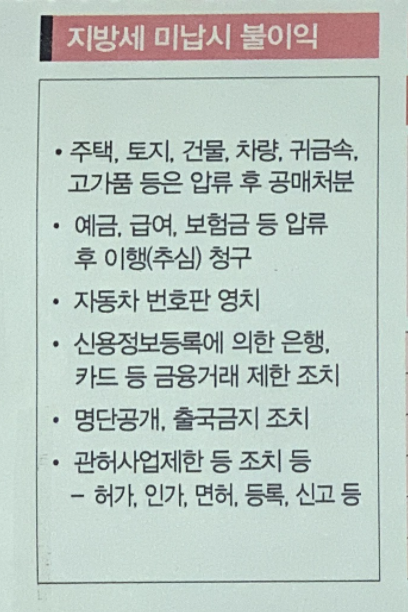 일단 납부 기한이 지나면 그 시점부터 가산점이 붙기 시작한다. 일정 기간 동안은 독촉 고지서가 날아오게 되고 그래도 납부를 하지 않으면 아래와 같은 불이익이 있다.