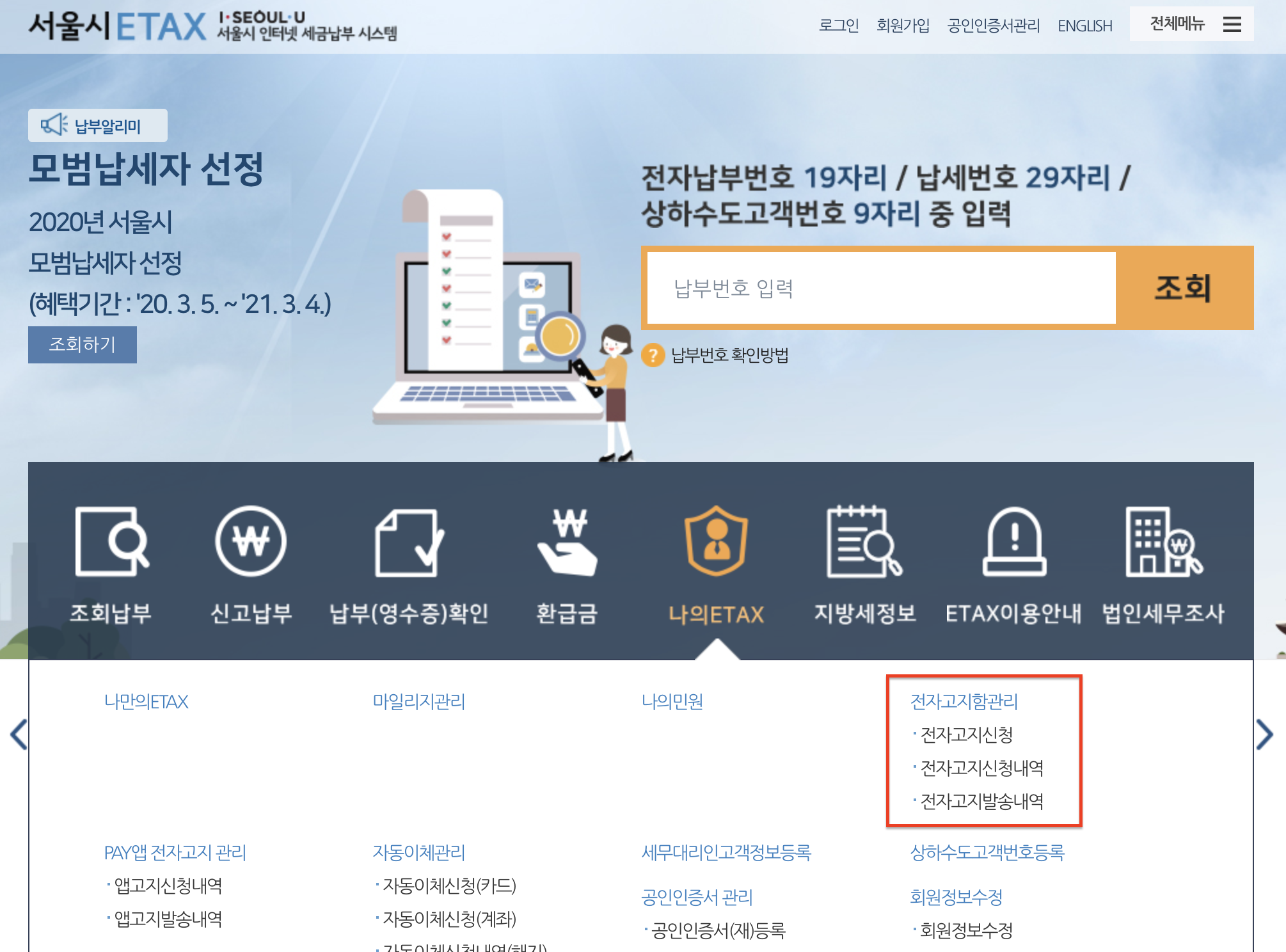 서울시 지방세의 경우 이택스(ETAX) 홈페이지에서 전자 고지 신청을 할 수 있다. 메인 메뉴 중 '나의 ETAX'에 들어가면 전자고 지함 관리라는 메뉴가 있는데 거기서 '전자고지신청'을 하면 된다. 회원 로그인, 비회원 로그인(공인인증서), 핸드폰 로그인이 가능하다. 자동이체 신청 메뉴도 여기에 함께 있다.