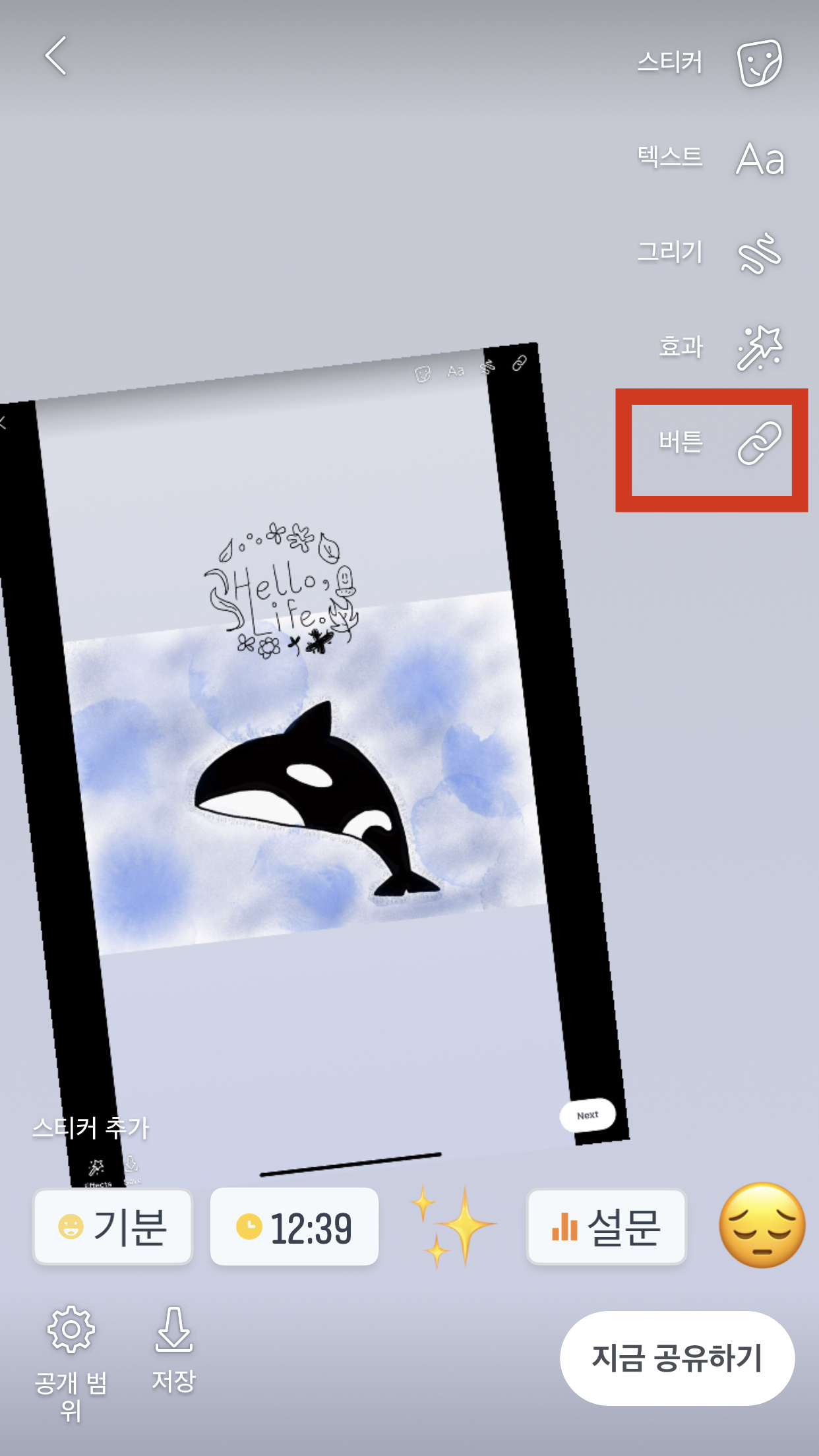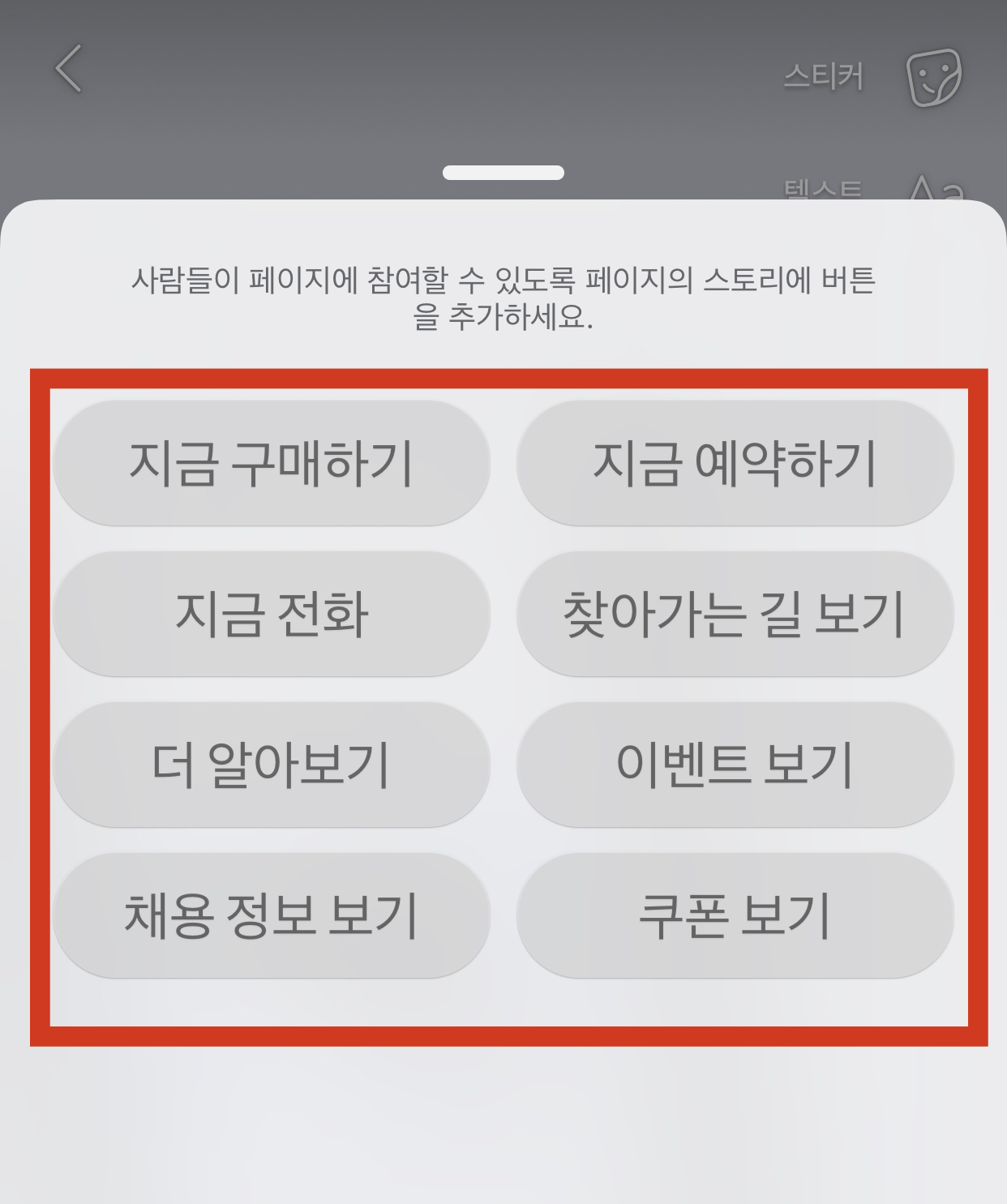 추가로 위에서도 언급했던 버튼 기능에 대해서도 간략하게 언급하고자 한다. 적은 팔로워 수로도 이 기능을 사용할 수 있다는게 아주 매력적으로 다가왔기 때문! 모바일이나 아이패드에서 스토리 만들기 모드에 들어가면 버튼이라는 메뉴를 볼 수 있다. 버튼을 클릭하면 지금 구매하기, 지금 예약하기, 지금 전화, 찾아가는 길 보기 등 다양한 버튼을 활용할 수 있게 마련되어 있다. 한 가지 중요한 것은 이 버튼을 사용하기 위해서는 미리 본인의 페이지에 해당하는 버튼이 활성화되어 있어야 한다. 페이지의 메인 화면에 있는 바로가기 버튼에 지정된 대로 링크가 걸리기 때문이다.