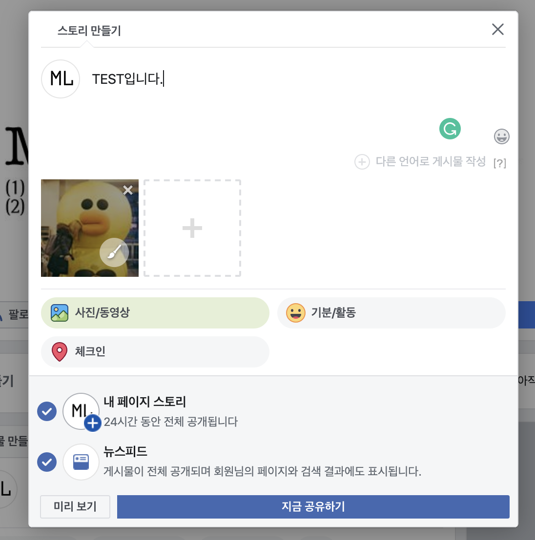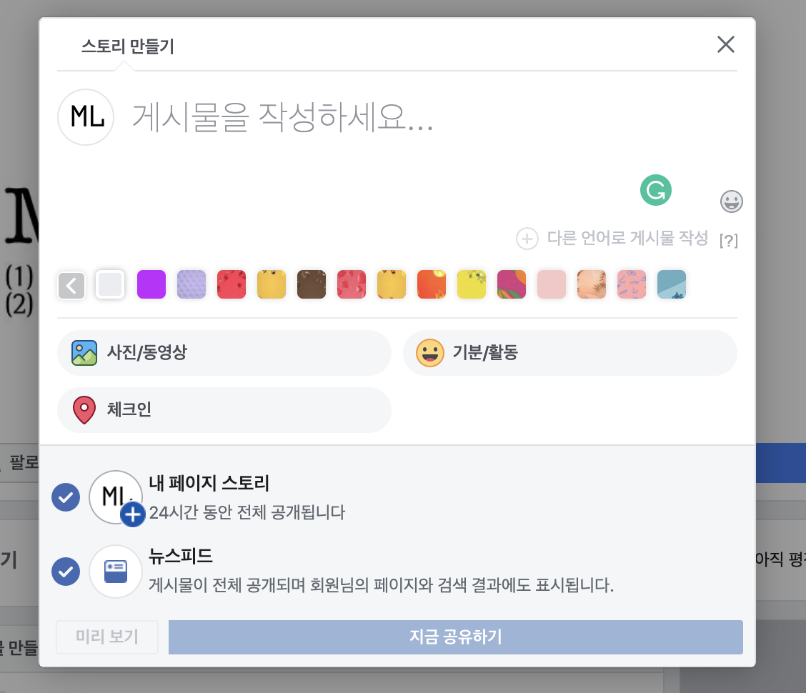 컴퓨터에서는 게시물 업로드가 되지 않는 인스타그램과는 달리 페이스북은 원래 고향이 웹사이트다 보니, PC를 자주 사용하는 유저들을 타겟팅 하기에도 좋은 플랫폼이다. 인스타그램에서는 컴퓨터로 사진이나 스토리를 올릴 수 없지만, 페이스북에서는 모두 가능하다. 하지만 웹사이트로 페이스북 페이지에 접속하면 게시물 작성하는 공간에서 '스토리'라는 단어를 찾아볼 수 없다. 웹사이트에서는 페이지 프로필 사진 옆의 '+' 버튼을 눌러야 한다. 그러면 바로 아래와 같이 게시물 작성 팝업이 뜬다. 일반 게시물 작성이 아닌 스토리를 만드는 공간이다. PC 페이스북 게시물 작성 툴을 그대로 차용한 것으로 보인다. 특이한 점은 모바일에서 스토리를 올리면 스토리에만 나타나지만, 컴퓨터에서는 스토리에만 보이게 할지 아니면 뉴스피드에도 함께 보이게 할지 선택을 할 수가 있다. 뉴스피드에 함께 보이게 할 경우 24시간이 지나도 뉴스피드에서는 사라지지 않는다.