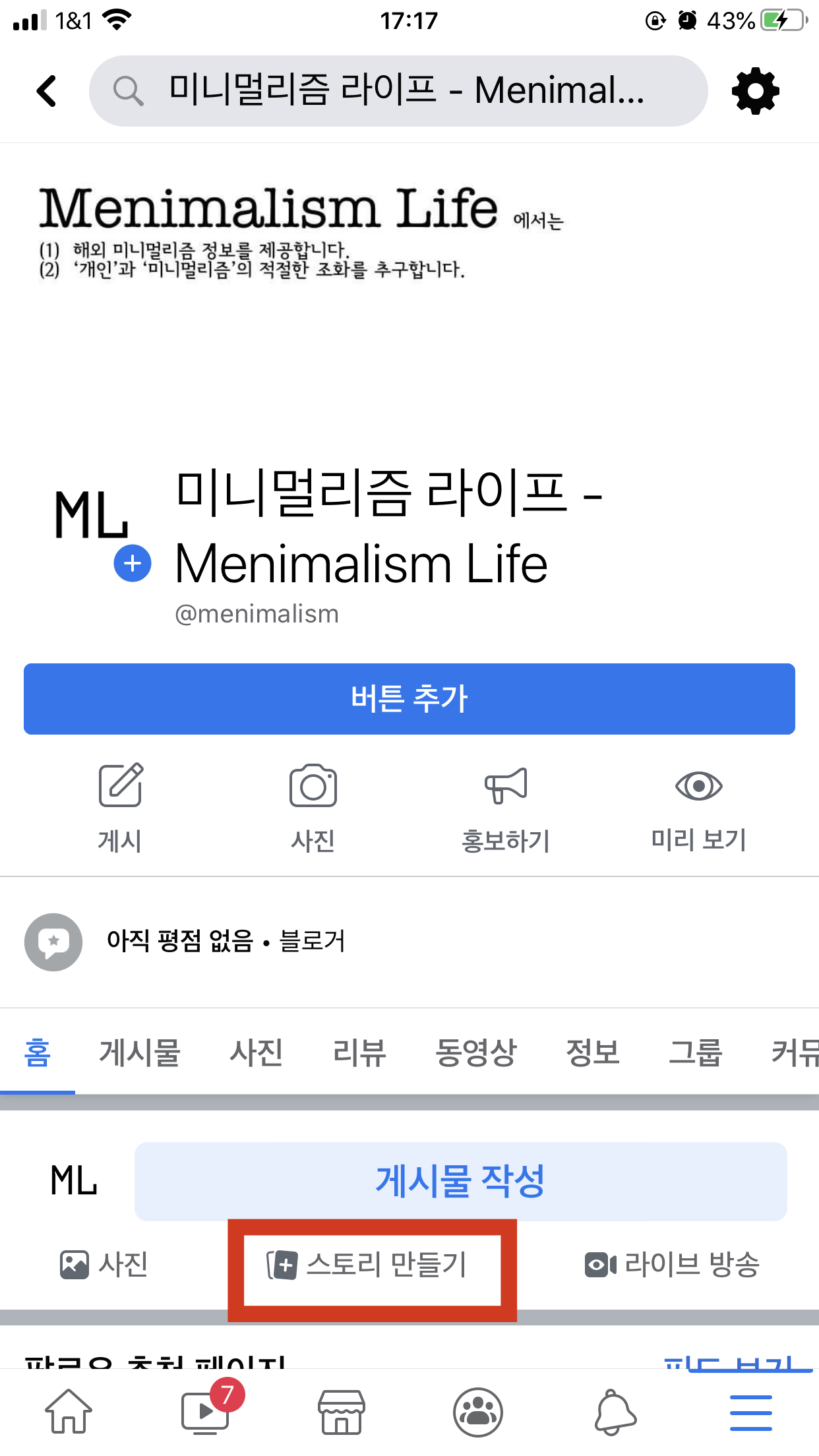 우선 스마트폰에서 페이스북 페이지 스토리를 올리는 법은 두가지가 있다. 애초에 스토리가 모바일에 특화된 것이라서 그런지 모바일에서는 접근이 용이하도록 설계되어 있다. (하지만 스토리 만들기 버튼이 모바일, 컴퓨터, 아이패드 모두 각각 다른 위치에 있다. 이것은 왜...? 무엇 때문에?;) 아무튼 모바일에서 올릴 수 있는 첫 번째 방법은 자신이 관리하는 페이지로 접속 시, 게시물 작성 버튼 아래에 '스토리 만들기'라는 버튼이 바로 보인다. 여기를 눌러서 인스타그램과 똑같은 방법으로 스토리를 만들면 된다. 단, 이 버튼은 일반 페이스북 앱으로 페이지에 접속했을 때만 보이며, 페이지 관리자 앱으로 들어갔을 때는 보이지 않을 수 있다. (아이폰 기준)