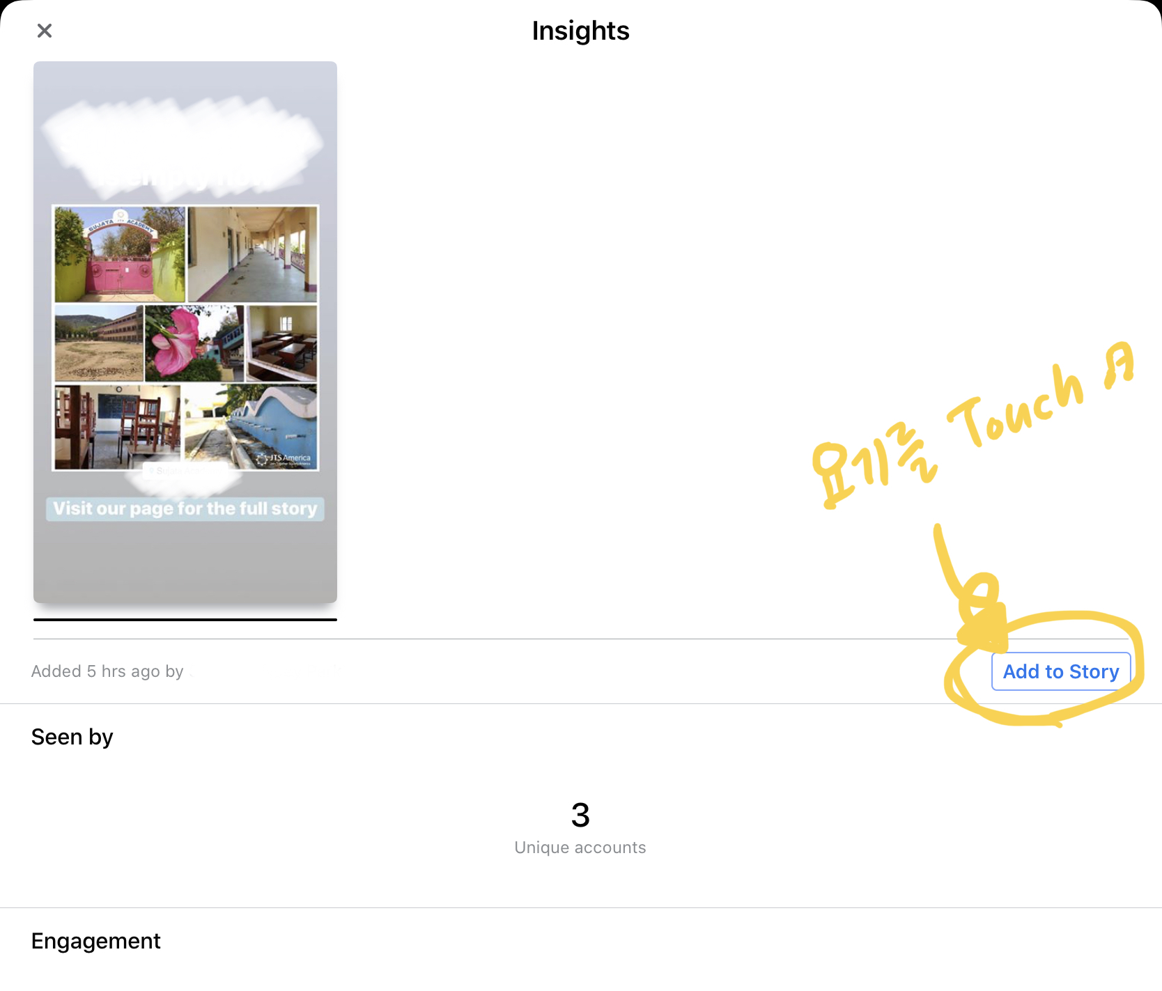 그러면 스토리 전용 인사이트 페이지로 넘어가게 된다. 거기에도 스토리 만들기 버튼은 없다. 당황하지 말고 그 페이지에서 현재 게시중인 스토리를 하나 터치해서 상세 인사이트 내용을 확인한다.