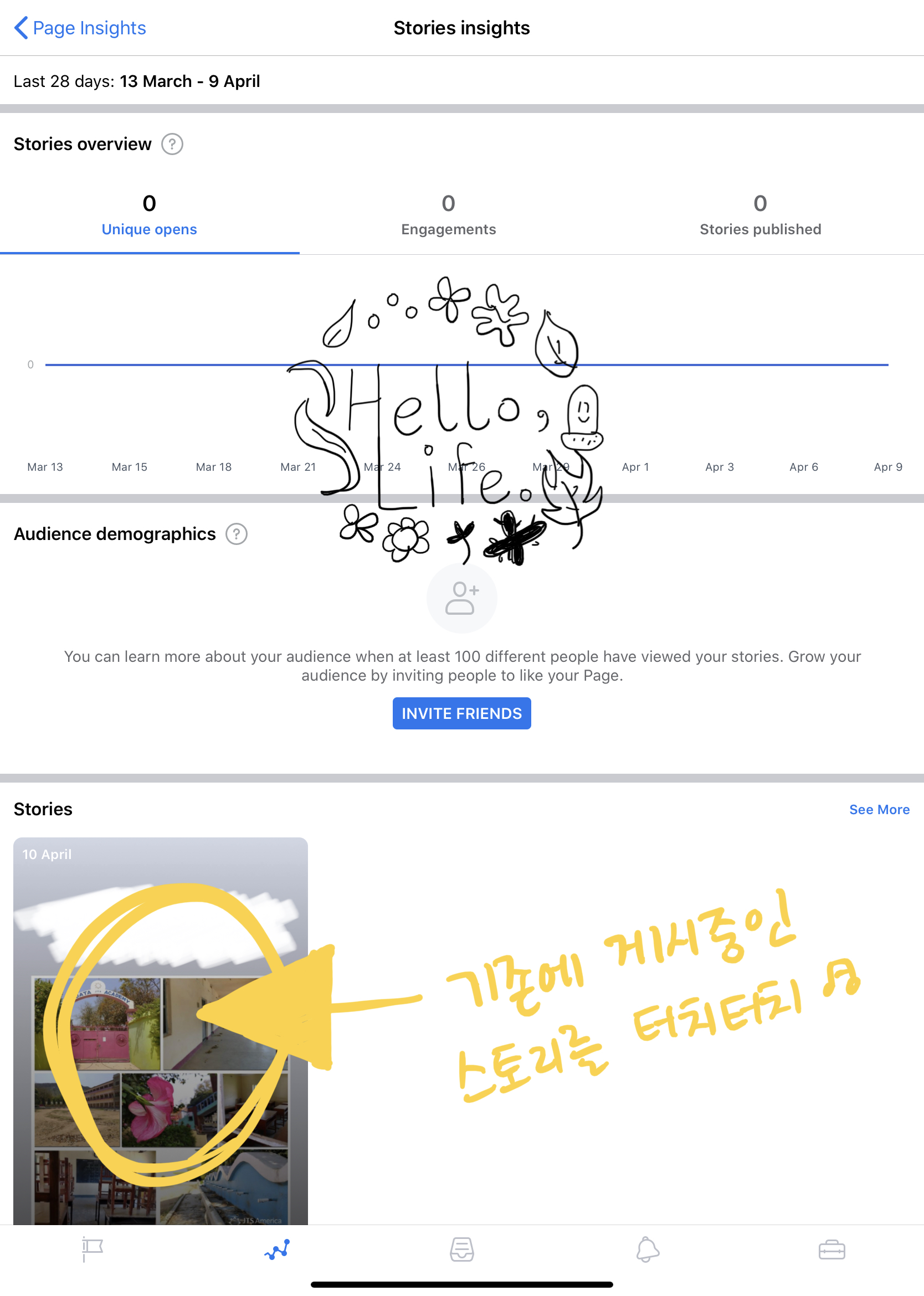 다음은 가장 고생했던 아이패드. 아이패드 사용자가 적어서 그런지 아이패드로 페이지 스토리 올리는 법은 검색해도 나오지 않을 정도였다. 한 시간 가까이 뒤져서 찾아냈으니 나 같은 누군가에게 도움이 되기를 바라며 포스팅. 우선 아이패드에서 페이스북 페이지 스토리를 올리려면 일반 페이스북 앱에서는 안되고 '페이스북 페이지 관리자'앱으로 들어가야 한다. 스토리를 올리고 싶은 페이지에 들어가서 가장 하단에 있는 메뉴 중 왼쪽에서 두 번째 탭, 즉 인사이트 메뉴로 들어간다.