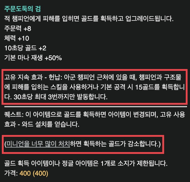 적 챔피언에게 기본 공격이든 스킬이든 피해를 입히면 1회당 15골드씩 돈을 번다. (30초당 최대 3번)