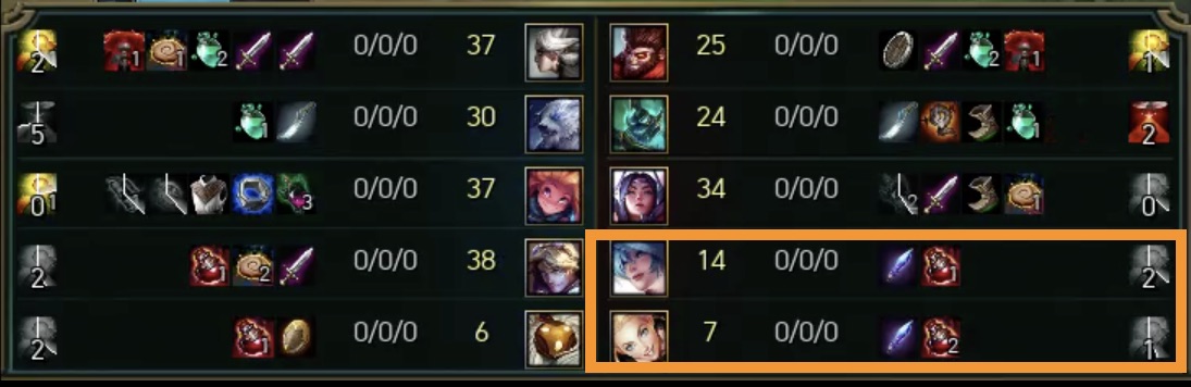 아래 스크린샷 이미지를 보면 알 수 있듯이 소나가 14개 먹을 때 럭스는 절반정도인 7개를 먹는 식이다.