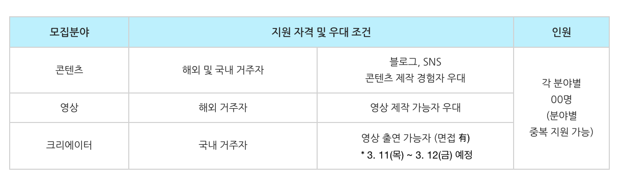 블로그를 처음 하는 블린이도 지원할 수 있지만! 주제가 주제인지라 블로그, SNS 콘텐츠 제작 경험자와 영상 제작 가능자가 우대되며, 크리에이터팀의 경우 영상 출연이 가능한 사람이 우대된다고 한다. (면접 일정도 잡혀있으니 위 표의 일정을 참고하도록 하자.) 만약 여러 분야를 모두 하고 싶다면 각 분야별로 중복 지원도 가능하다.