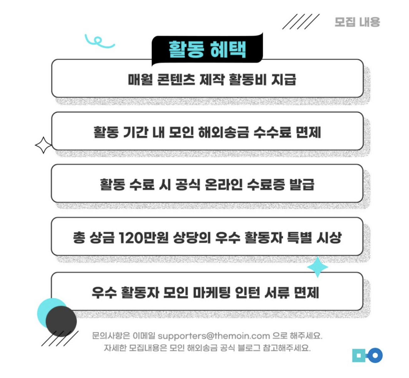 매월 콘텐츠 제작에 대한 활동비도 지원되고, 활동 기간 중에는 모인 해외 송금 수수료 면제까지 면제된다고 하니 귀가 솔깃했다. 또 활동을 수료하면 공식 온라인 수료증도 주고 우수 활동자에게는 총 상금 120만원 상당의 특별 시상도 있다고 한다. 만약 취업을 준비하고 있는 사람이라면 우수 활동자에게 모인 마케팅 인턴 지원시 서류 지원을 면제해준다고 하니 혜택이 하나 더 늘어나는 셈이다.