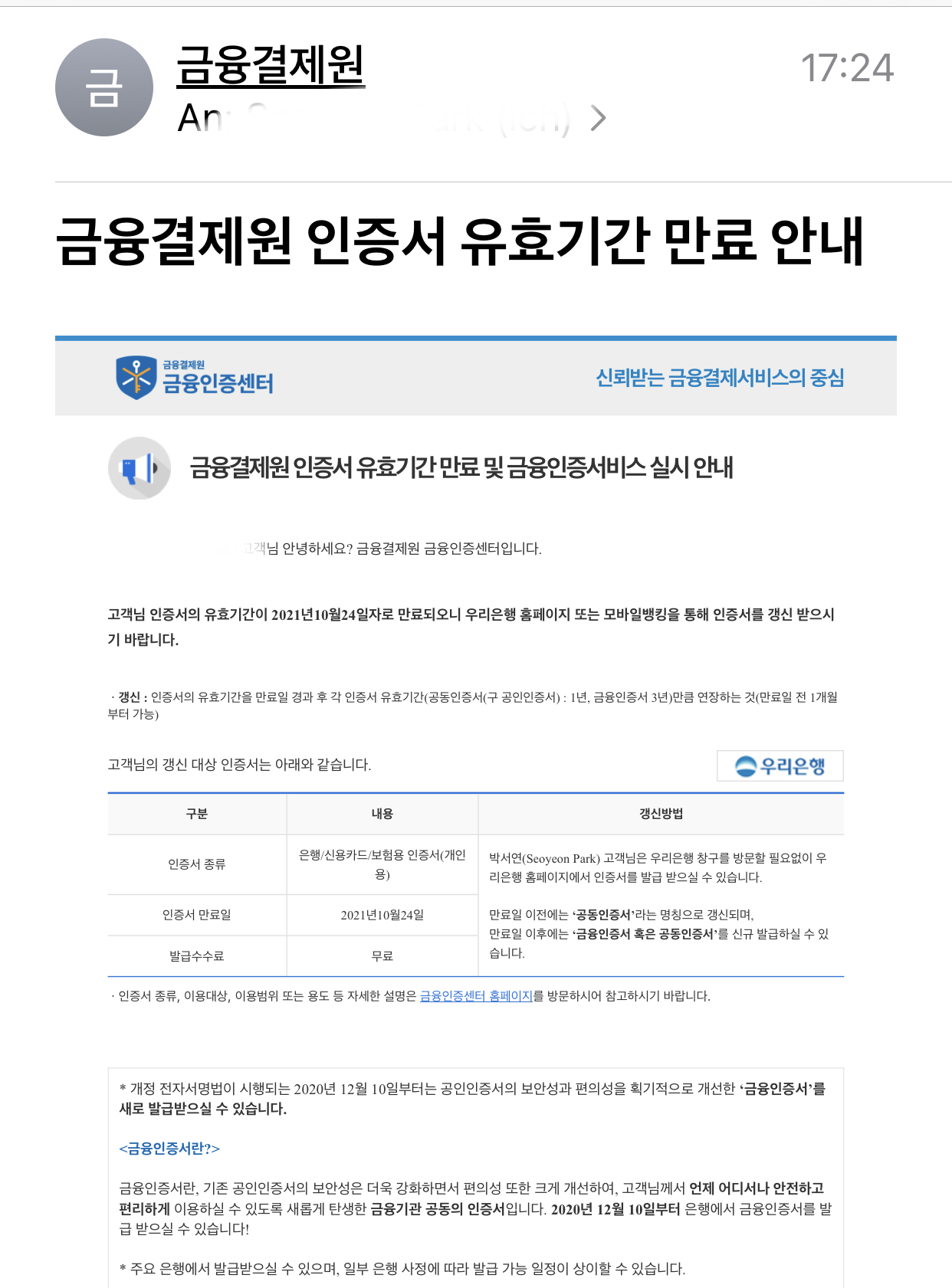 금융결제원의 인증서 유효기간이 만료되어 간다는 안내 이메일이었죠.