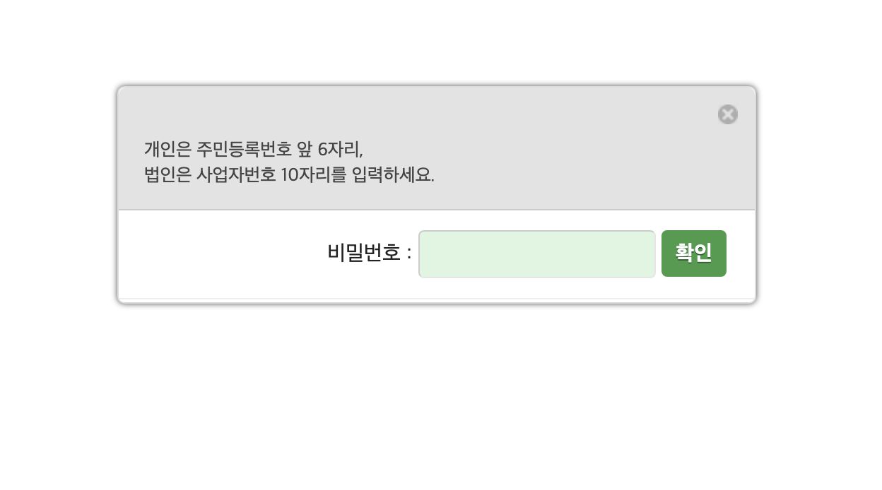 개인의 경우 주민번호 앞 6자리 (생년월일), 법인의 경우 사업자 번호 10자리를 입력한 후 '확인' 버튼을 누릅니다.